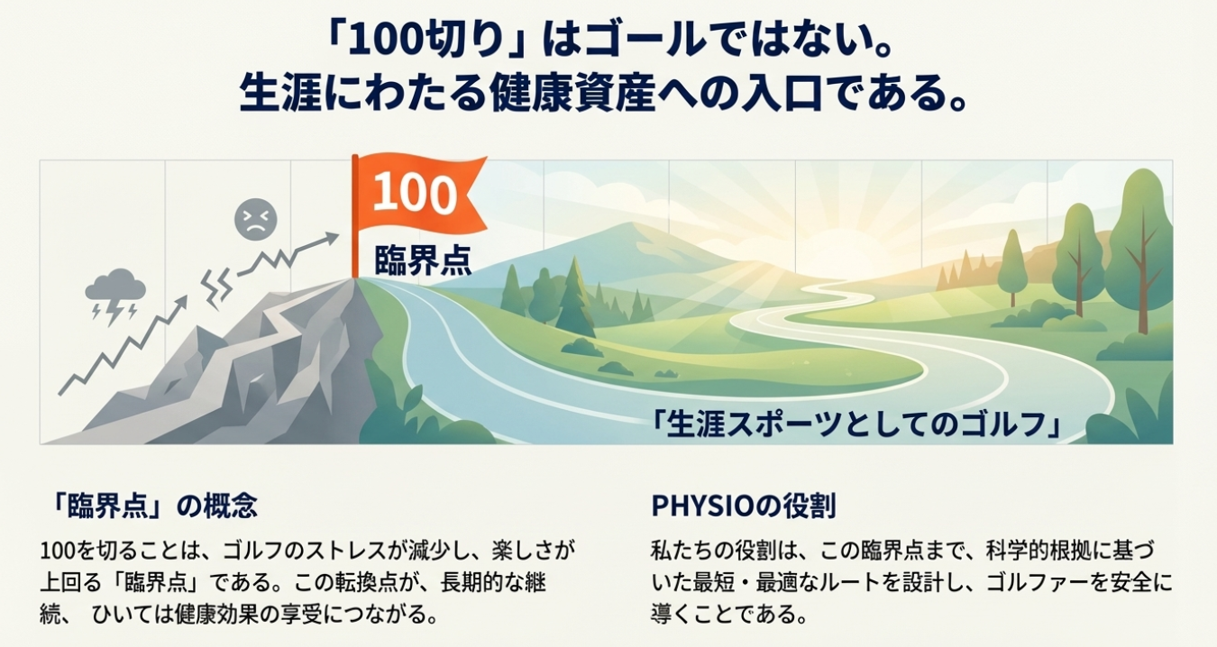 フィジオゴルフフィットネスは、感覚論に頼るのではなく、科学的根拠に基づいて上達の構造を明確にし、100切りという達成体験を通じて、ゴルフを続ける理由そのものを支えていきます。
